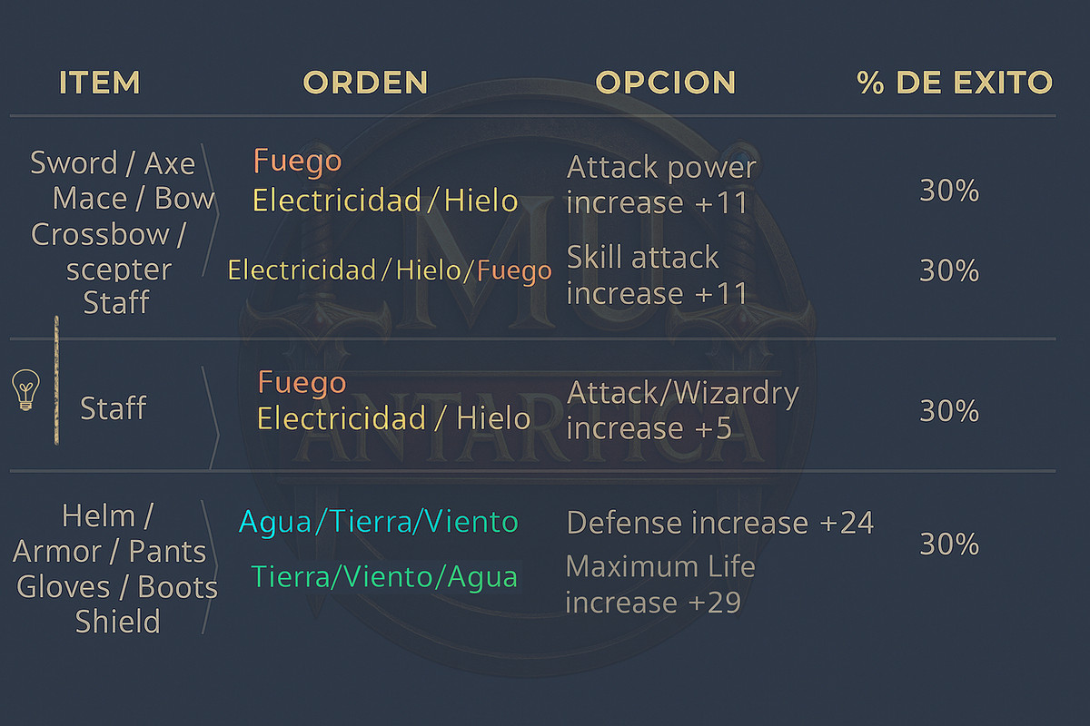 1 Fuego / 1 Agua / 1 Hielo / 1 Viento / 1 Electricidad / 1 Tierra ➟ Double Damage Rate +3%